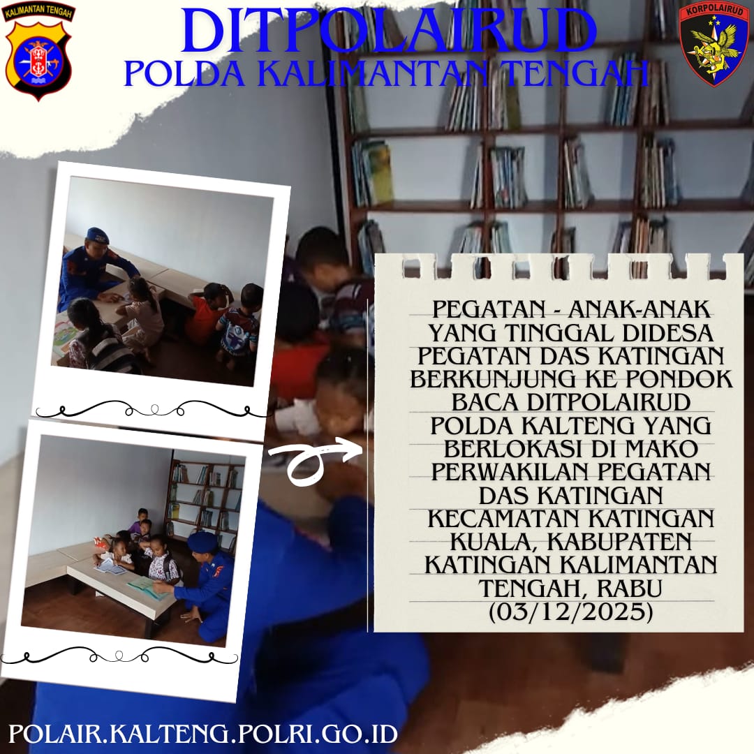 SUARA DAYAK.COM, Pegatan – Anak-anak yang tinggal di Desa Pegatan DAS Katingan berkunjung ke Pondok Baca Ditpolairud Polda Kalteng Mako Perwakilan Pegatan, Kabupaten Katingan, Rabu (3/12/2025).