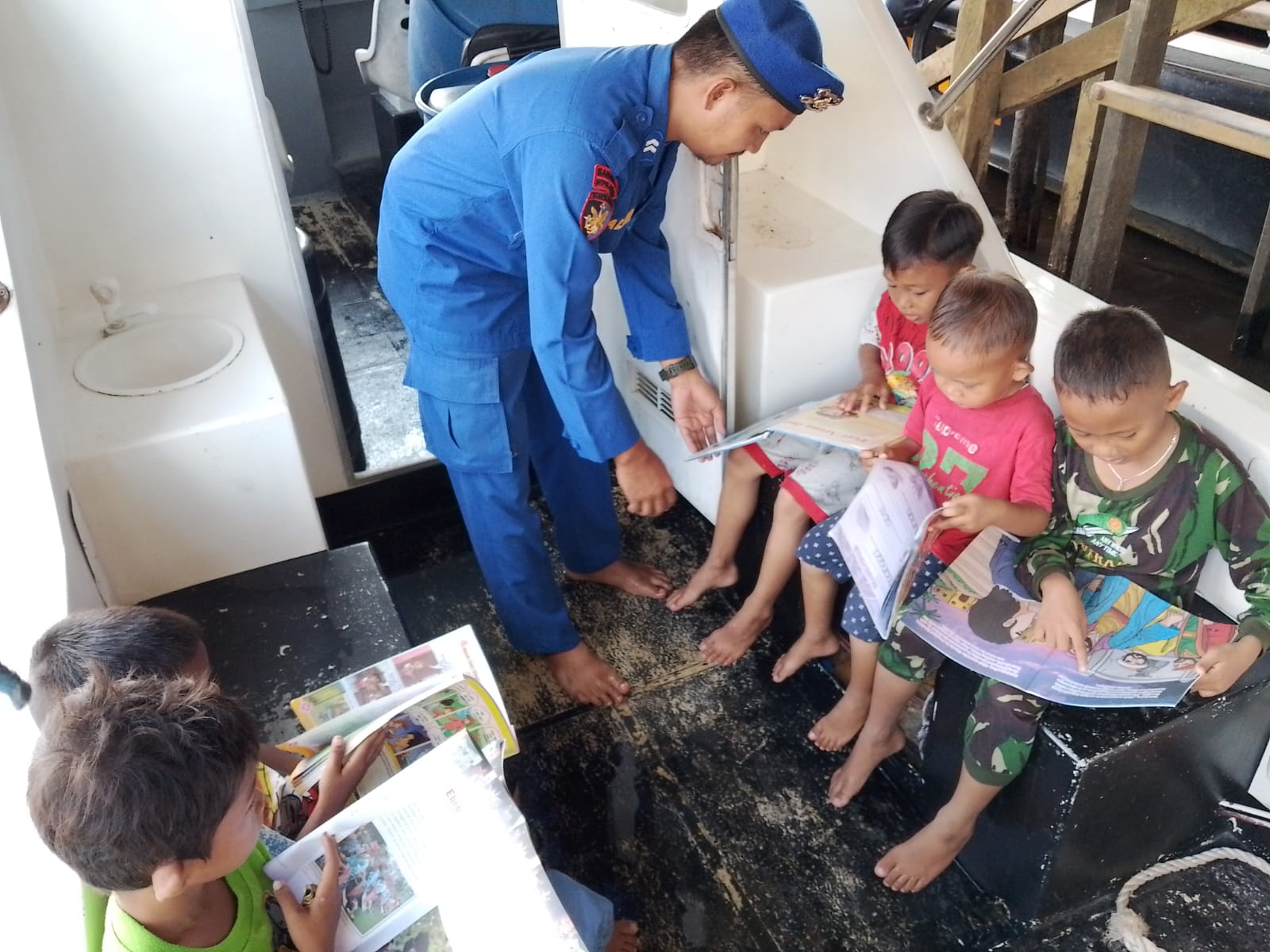 Personel KP XVIII-1006, mengajak mereka untuk membaca buku yang telah di sediakan guna menambah wawasan dan pengetahuan bagi anak-anak tersebut di perpustakaan terapung, Kabupaten Katingan.