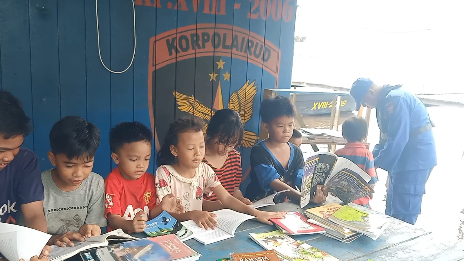 Anak-anak pesisir sungai yang berkunjung sangat antusias belajar dan membaca di perpustakaan terapung KP XVIII-2006, Sabtu (4/4/2026) pagi.