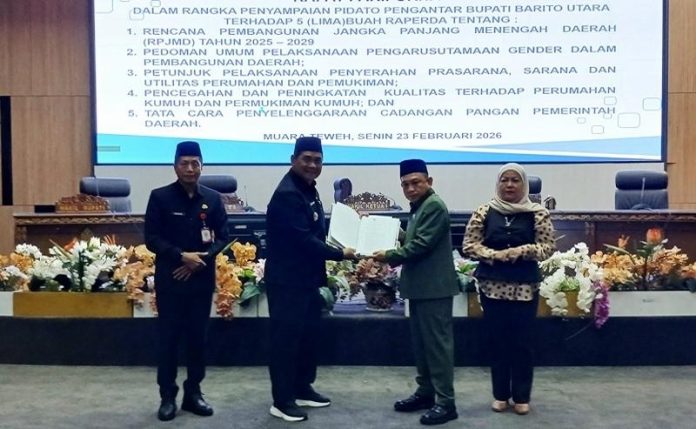 SUARADAYAK.COM, Muara Teweh – Bupati Barito Utara, Shalahuddin, memaparkan Rancangan Peraturan Daerah (Raperda) tentang Rencana Pembangunan Jangka Menengah Daerah (RPJMD) Kabupaten Barito Utara Tahun 2025–2029 di depan rapat paripurna DPRD di Muara Teweh, Senin (23/2/2026).