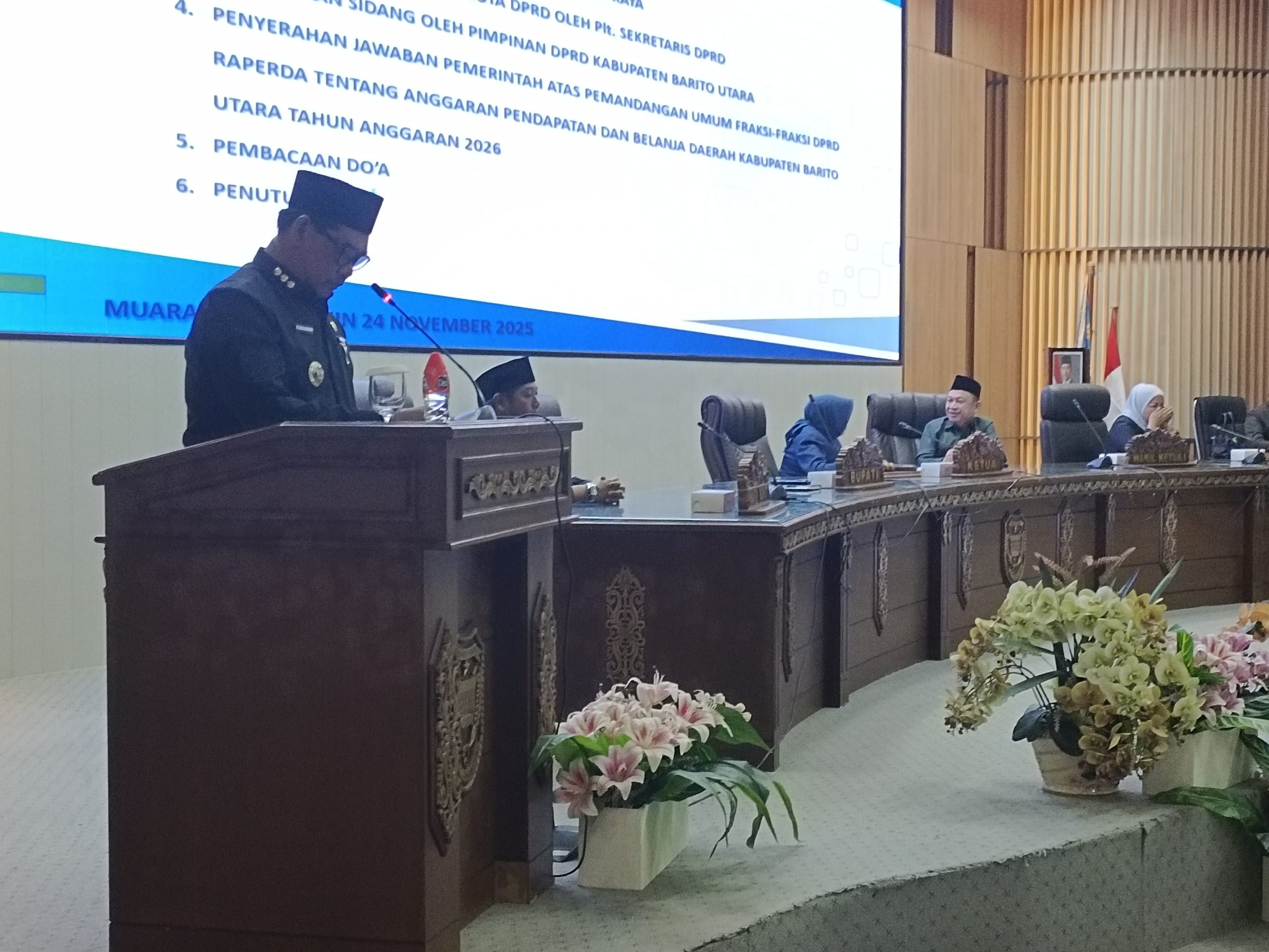 SUARA DAYAK.COM, Muara Teweh – Bupati Barito Utara, Shalahuddin, menjawab pemandangan umum lima fraksi pendukung DPRD terhadap Rancangan APBD 2026, saat sidang paripurna di Muara Teweh, Senin (24/11/2025).