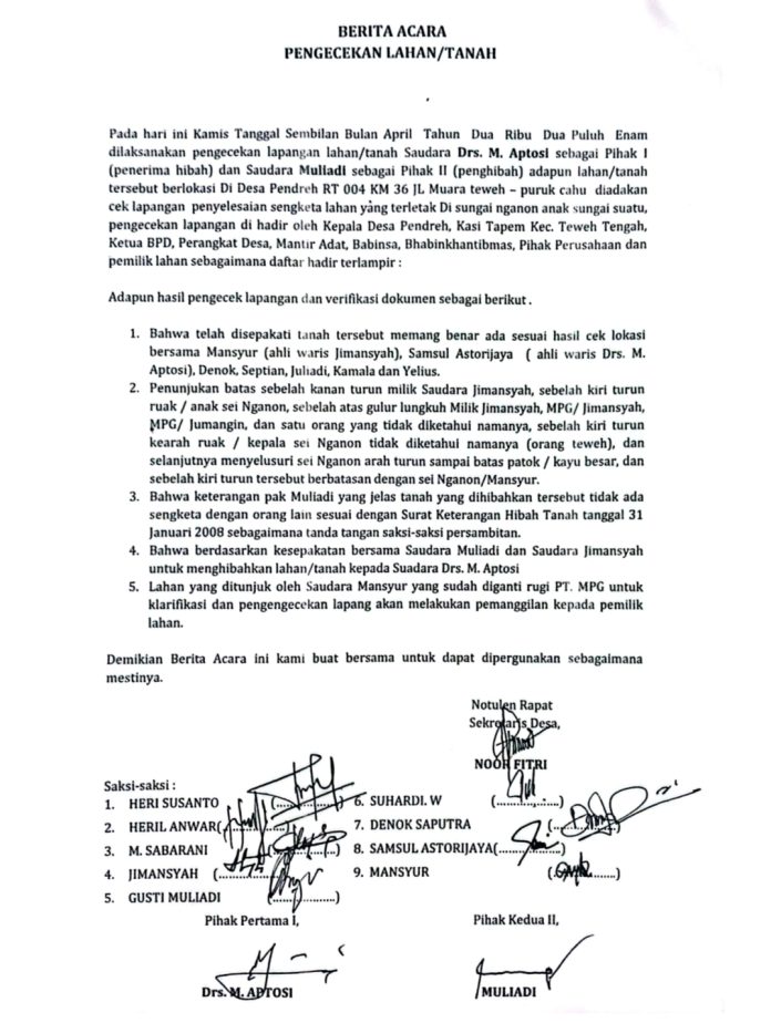 Berita acara pengecekan lahan milik M. Aptosi ditandatangani oleh 11 pihak. Di antaranya pemberi hibah, Muliadi dan Jimansyah, Ketua BPD Pendreh Agus, Gusti Muliadi (pendamping Aptosi). Sedangkan dari pihak PT. Multi Persada Gatra Megah (MPG) Denok dan Septian.