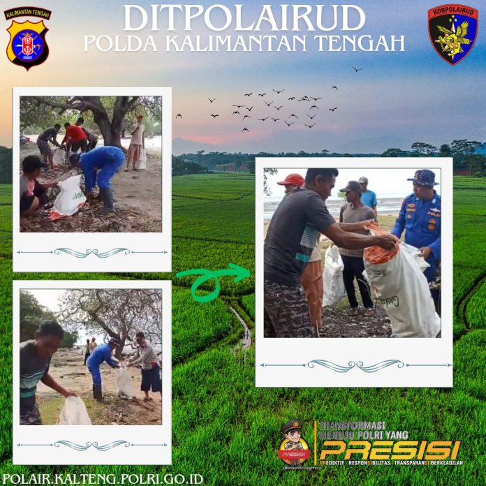 SUARA DAYAK.COM, Kasongan – Personel Ditpolairud Polda Kalteng Mako Perwakilan Pegatan DAS Katingan, beserta masyarakat Kampung Keramat membersihkan sampah di Pantai Kempeng Pegatan, Kabupaten Katingan. Rabu (7/1/2026) pagi.
