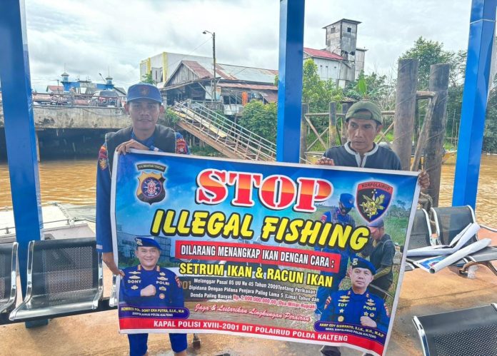 SUARA DAYAK.COM, Buntok – Kapal Polisi XVIII-2001 Ditpolairud Polda Kalteng, mengimbau masyarakat untuk menghentikan praktik ilegal fishing di perairan Indonesia, khususnya DAS Barito, Kabupaten Barito Selatan, Kamis (27/11/2025).