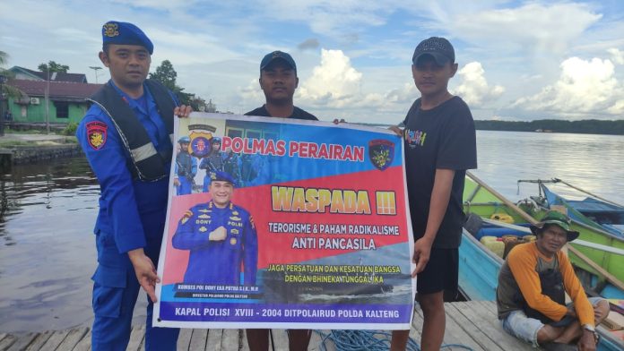 SUARA DAYAK.COM, Pangkalan Bun – Personel Ditpolairud Polda Kalteng KP XVIII – 2004 DAS Kumai melaksanakan kegiatan sambang ke masyarakat sekitar Desa Kubu, Kecamatan Kumai, Kabupaten Kobar, guna mencegah paham terorisme dan radikalisme anti Pancasila, Jumat (19/12/2025).