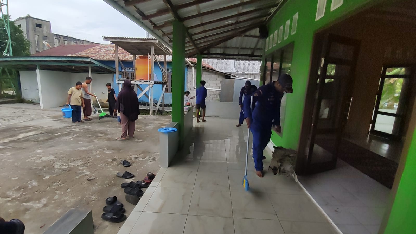 Anggota Kapal Patroli XVIII-2004 bersama masyarakat membersihkan area dalam mushola, halaman, tempat wudhu, dan hingga saluran air di sekitar.