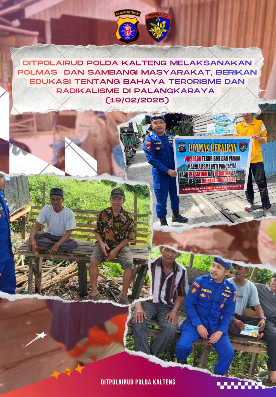 SUARA DAYAK.COM, Palangkaraya – Anggota Ditpolairud Polda Kalteng di DAS Kahayan, melaksanakan Polmas kepada masyarakat sekitar dengan mengimbau dan mengedukasi tentang bahaya paham terorisme dan radikalisme anti Pancasila, Selasa (19/2/2026).