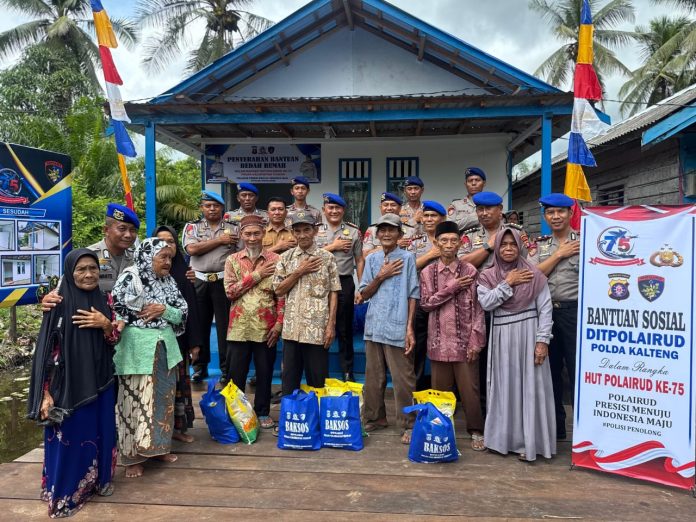 SUARA DAYAK.COM, Sampit – Memperingati HUT ke-75 Korps Polairud, Dirpolairud Polda Kalteng, Wadir Polairud, dan PJU menggelar bakti sosial pembagian bantuan sosial (bansos) dan penyerahan bantuan program bedah rumah di Kecamatan Mentaya Hilir Selatan, Kabupaten Kotim, Senin, 15 Desember 2025.