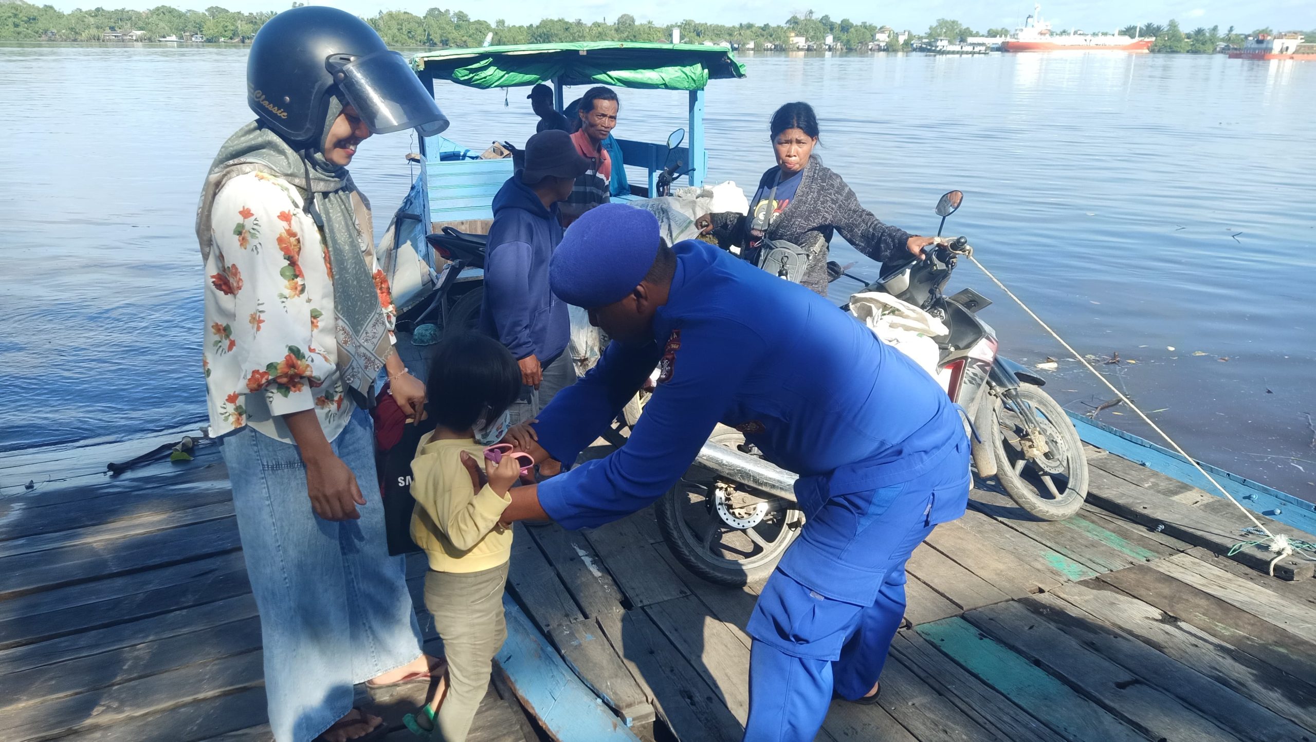 Selain berpatroli menjaga kamtibmas, personel Ditpolairud Polda Kalteng, Bripka Bledug Purbaya dan Bharatu Prayogi, memeriksa alat keselamatan kapal feri penyeberangan tradisional yang beroperasi di Sampit, Kabupaten Kotawaringin Timur, Selasa (30/12/2025).