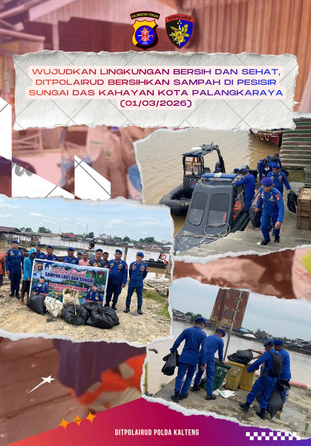SUARA DAYAK.COM, Palangkaraya – Ditpolairud Polda Kalteng, melalui Mako Perwakilan Palangkaraya DAS Kahayan beserta masyarakat Kampung Tengah membersihkan sampah, Minggu (1/3/2026).
