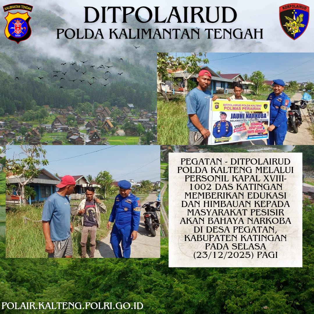 SUARA DAYAK.COM, Kasongan – Personel Ditpolairud Polda Kalteng Kapal Polisi XVIII-1002 DAS Katingan, mengedukasi dan mengimbau kepada masyarakat pesisir tentang bahaya narkoba di Desa Pegatan, Kabupaten Katingan, Selasa (23/12/2025) pagi.
