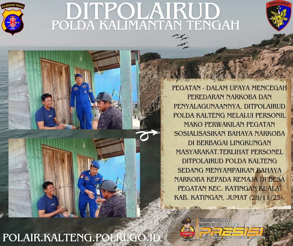 Terlihat personel Ditpolairud Polda Kalteng menyampaikan sosialisasi tentang bahaya narkoba kepada para remaja di Desa Pegatan, Kecamatan Katingan Kuala, Kabupaten Katingan, Jumat (28/11/2025).