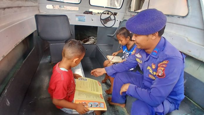 Ditpolairud Polda Kalteng, melalui Personel Mako Perwakilan DAS Jelai mengajak para pelajar membaca di Kapal Polisi berkaitan dengan kegiatan perpustakaan terapung.