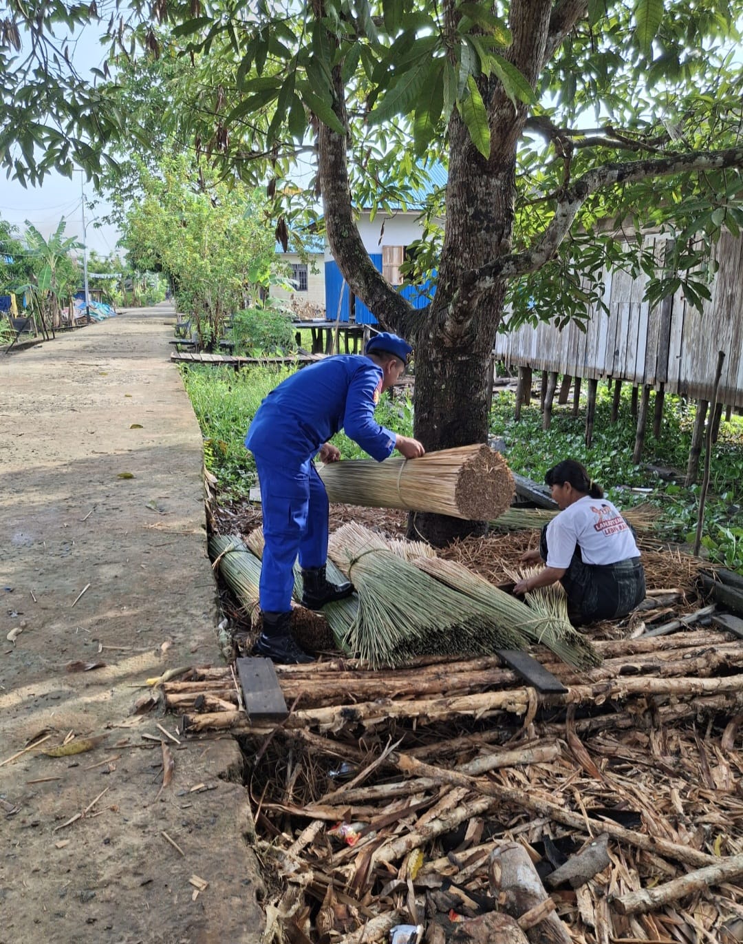 Seorang personel Ditpolairud Polda Kalteng membantu berbagai kegiatan masyarakat di Desa Palangkau Lama, Kabupaten Kapuas, Jumat (10/4/2026).