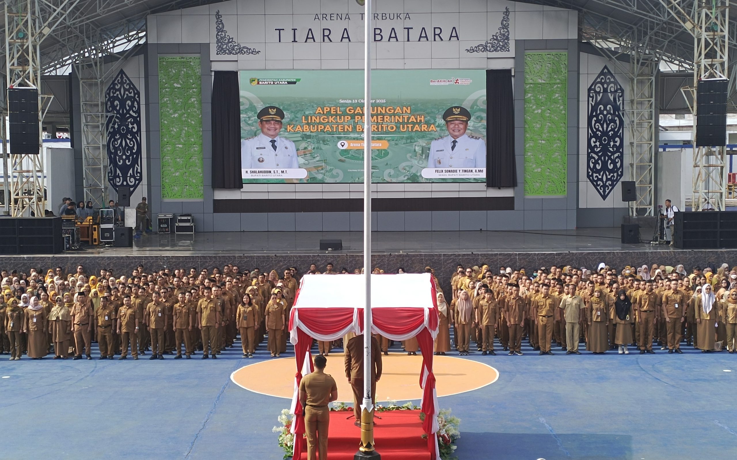 SUARADAYAK.COM – Bupati Barito Utara, Shalahuddin, dan Wakil Bupati Felix Sonadie Y.Tingan, mengikuti apel gabungan sekaligus apel pertama keduanya sebagai pimpinan daerah di Muara Teweh, Senin (13/10/2025), pukul 07.35 WIB.