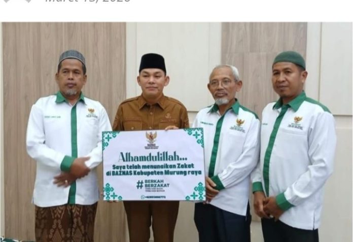 Suara Dayak.com, Puruk Cahu — Wakil Bupati Murung Raya, Rahmanto Muhidin, menunaikan zakat pribadinya melalui Badan Amil Zakat Nasional (BAZNAS) Kabupaten Murung Raya. Langkah tersebut sekaligus menjadi ajakan bagi Aparatur Sipil Negara (ASN) serta kalangan pengusaha di daerah itu untuk menyalurkan zakat, infak, dan sedekah melalui lembaga resmi tersebut.
