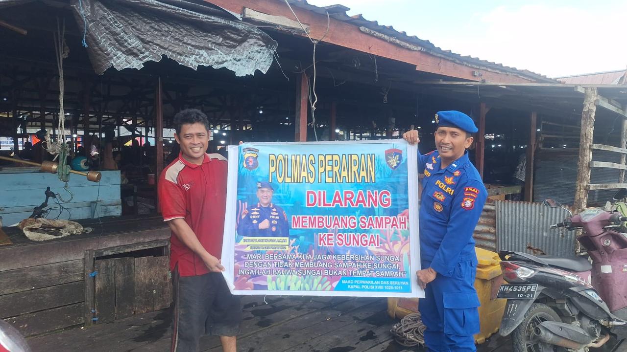 SUARA DAYAK.COM, Pangkalan Bun – Personel Ditpolairud Polda Kalteng Mako Perwakilan DAS Arut, mengimbau dan melarang masyarakat membuang sampah ke sungai di Desa Tanjung Putri, Kabupaten Kotawaringin Barat, Minggu (9/11/2025) pagi.